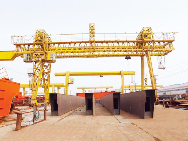 門架為桁架結(jié)構(gòu),具有結(jié)構(gòu)輕、抗風力強等優(yōu)點。包括主梁、上端梁、支腿、下端梁、走行臺車及走臺欄桿等。主梁采用三角桁架結(jié)構(gòu),上面鋪設有軌道,供小車沿主梁方向作橫向移動。支腿采用箱形或鋼管兩種形式。